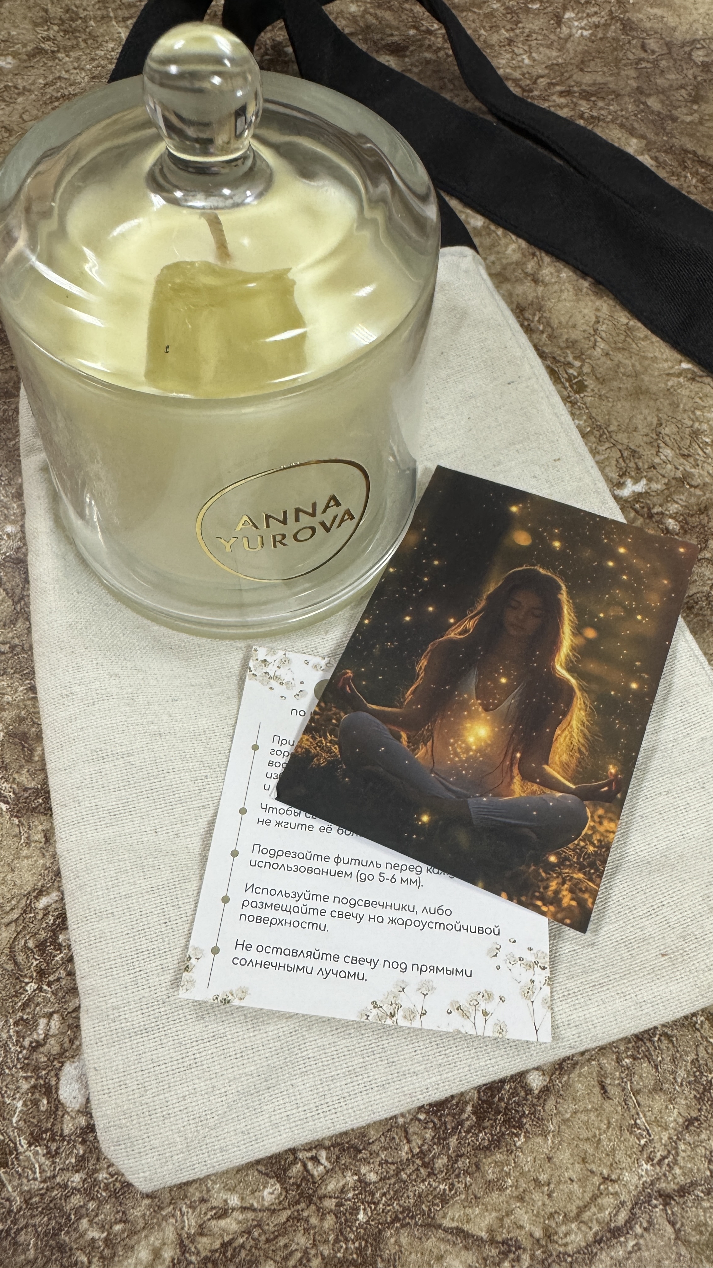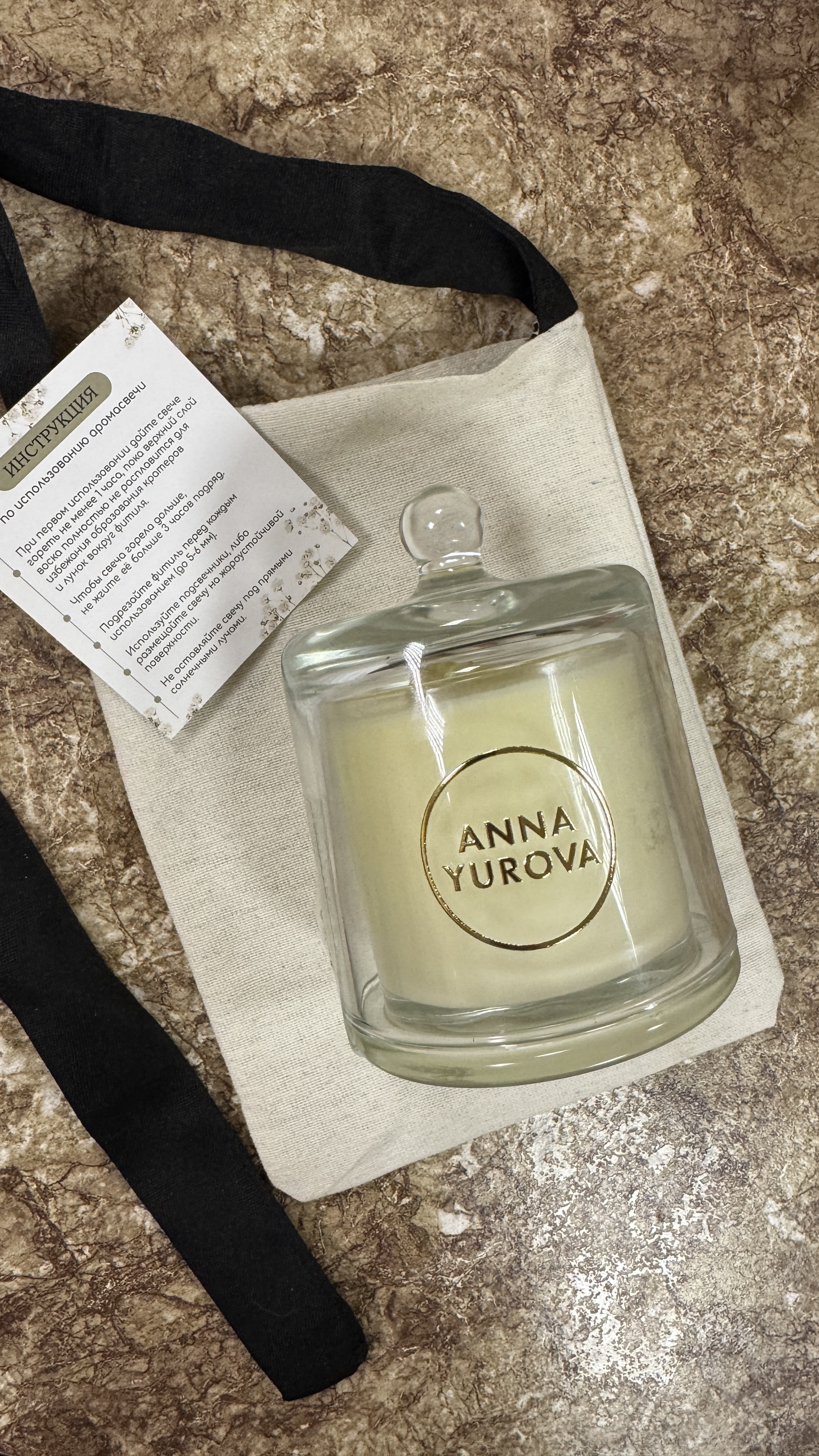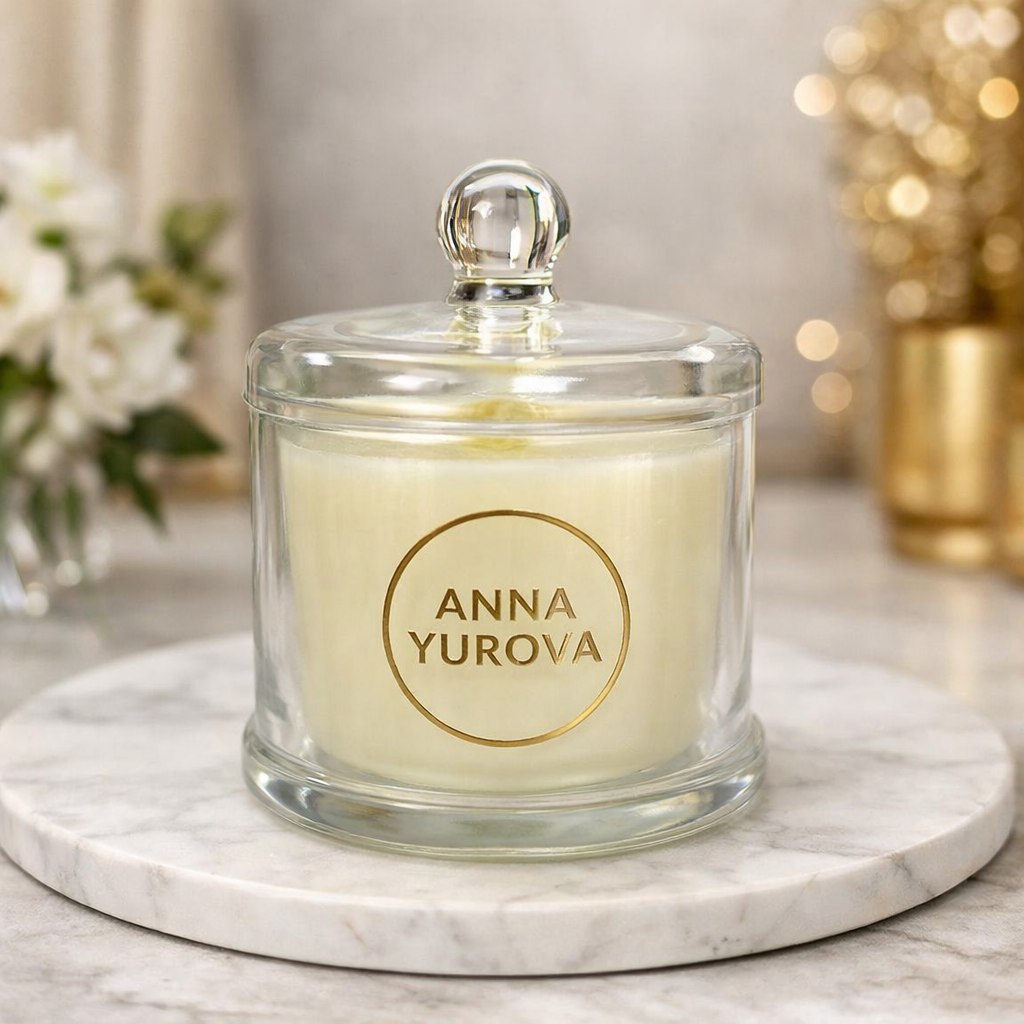 Упаковка: элегантный стеклянный подсвечник с золотым логотипом ANNA YUROVA.