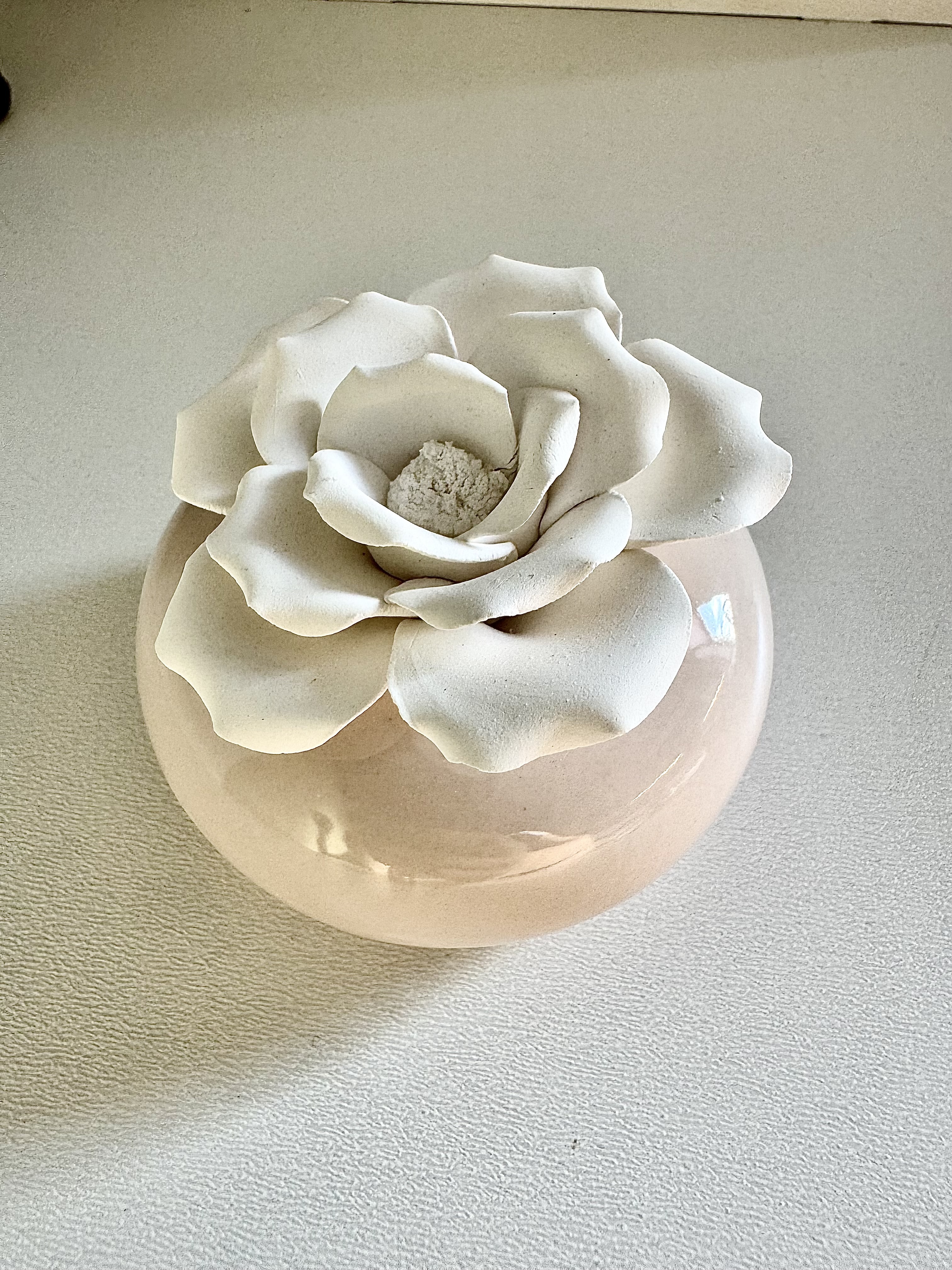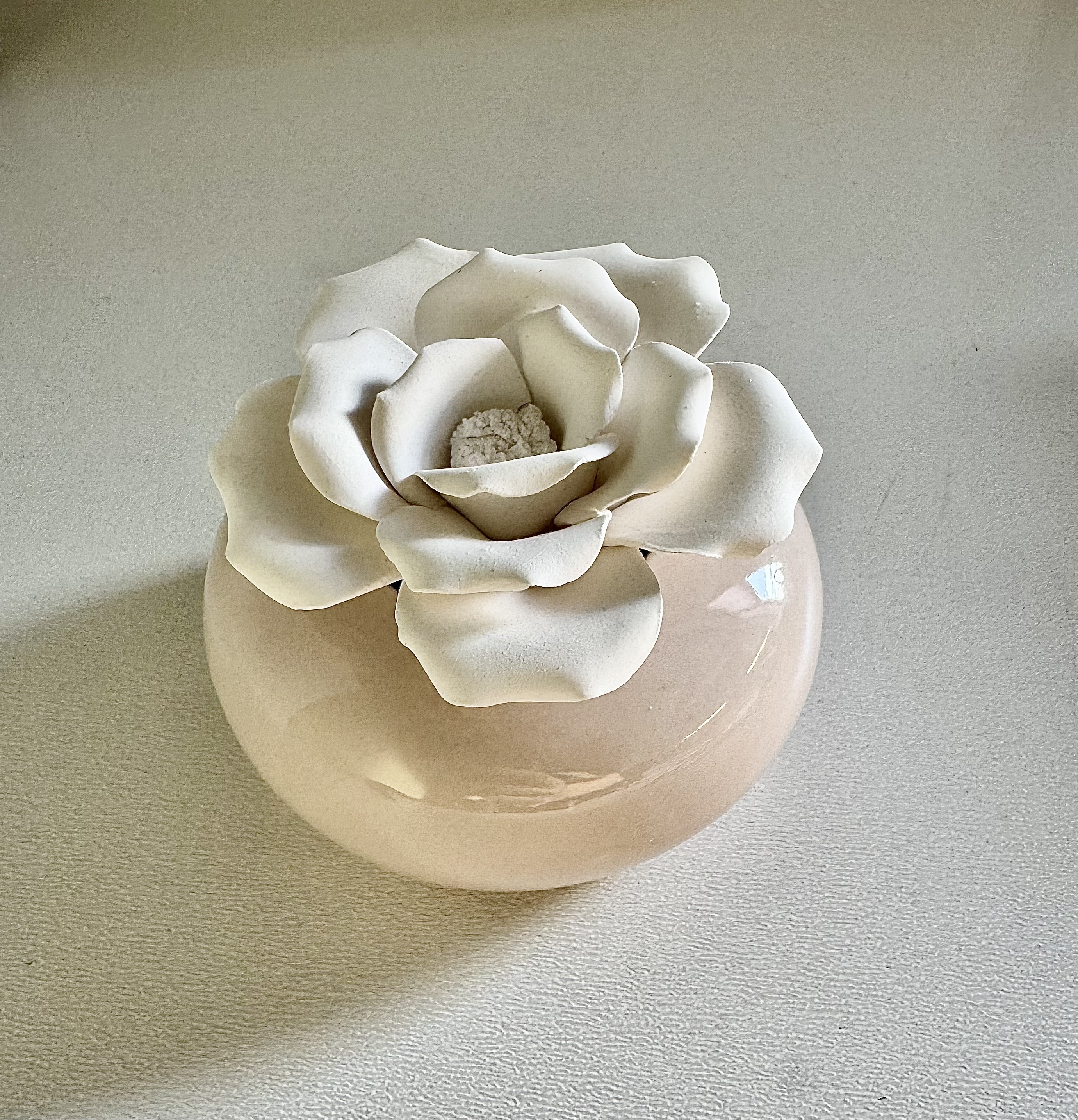 2. декоративного элемента – цветка из гипса. Этот цветок, ручной работы, не просто украшает диффузор, но и является неотъемлемой частью его функциональности. Внутри цветка расположен пористый гипсовый материал, который, подобно фитилю, впитывает ароматическое масло и постепенно высвобождает его в воздух, наполняя помещение тонким и ненавязчивым ароматом. На цветке закреплен шнурок для впитывания ароматического масла.